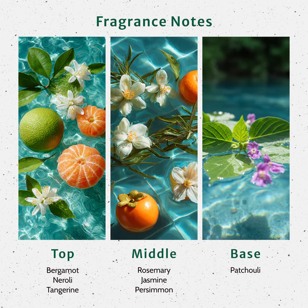 De geur opent met verfrissende topnoten van bergamot, neroli en mandarijn. Deze combinatie zorgt meteen voor een lichte, frisse en energieke geur die perfect past bij moderne verzorgingsproducten.