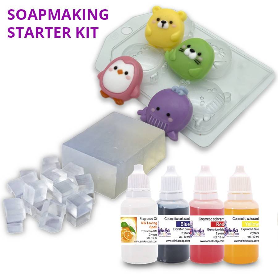 Startpakket Zeep Maken – 1000 g Transparante Zeepbasis, Geur Sinaasappel, Mal Cartoon Diertjes & Stickers